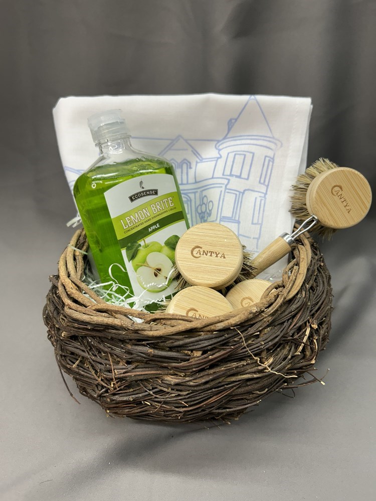 Eco-conscious dishwashing basket contains a wand with four compostable scrubbing heads, biodegradable apple-scented soap, and a Ticknor Mansion-branded dishtowel! The basket can be reused as a bird's nest :)